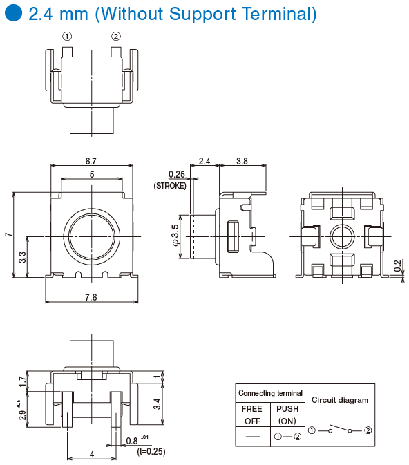 | CF-CA-1CB4-P202 | 1 bit | OFF -(ON) | Gold plated | Resin button 2.4 mm | R/A Without Support terminal | 20 pcs./pack | |