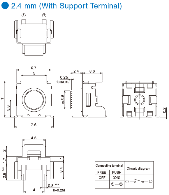 | CF-CA-1CB4-P211T | 1 bit | OFF -(ON) | Silver plated | Resin button 2.4 mm | R/A With Support terminal | 500 pcs./reel | |