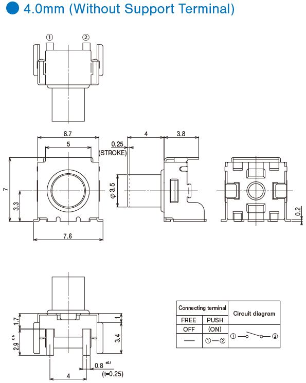 | CF-CA-1CB4-P402 | 1 bit | OFF -(ON) | Gold plated | Resin button 4.0 mm | R/A Without Support terminal | 20 pcs./pack | |