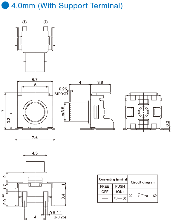 | CF-CA-1CB4-P412 | 1 bit | OFF -(ON) | Gold plated | Resin button 4.0 mm | R/A With Support terminal | 20 pcs./pack |