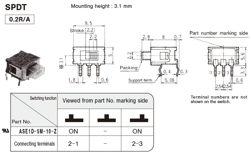ASE1D-5M-10-Z | SPDT | Right angle(0.2inch pitch) | ON-ON | 安装表面上方的高度: 3.1 mm | |