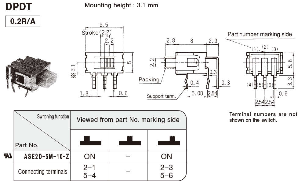 ★ASE2E-2M-10-Z | DPDT | PC 针脚 | ON-OFF-ON | 端子列 : 2.54 mm | |
