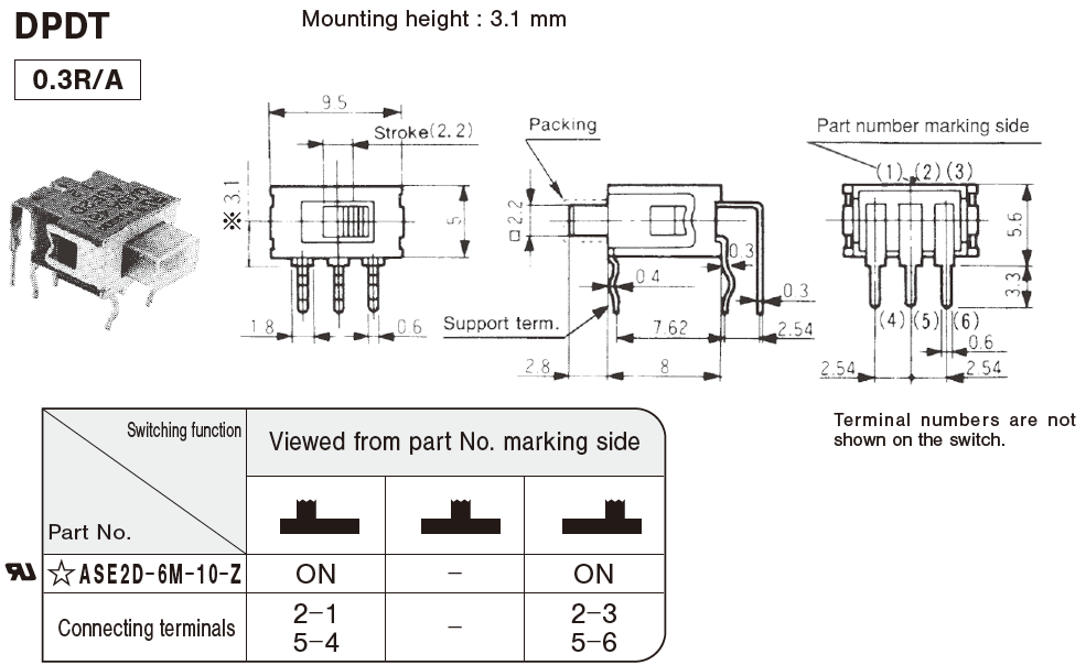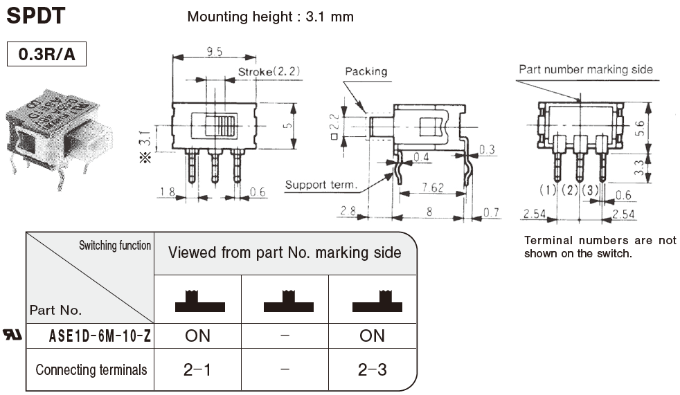 ASE1D-6M-10-Z | SPDT | Right angle(0.3inch pitch) | ON-ON | 安装表面上方的高度: 3.1 mm | |