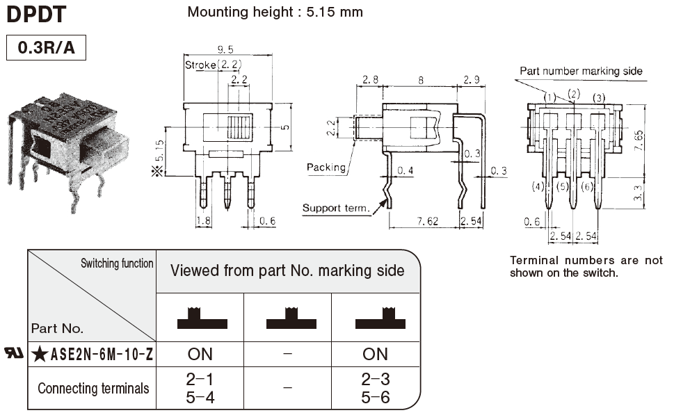 ★ASE2N-6M-10-Z | DPDT | Right angle(0.3inch pitch) | ON-ON | 安装表面上方的高度: 5.15 mm |