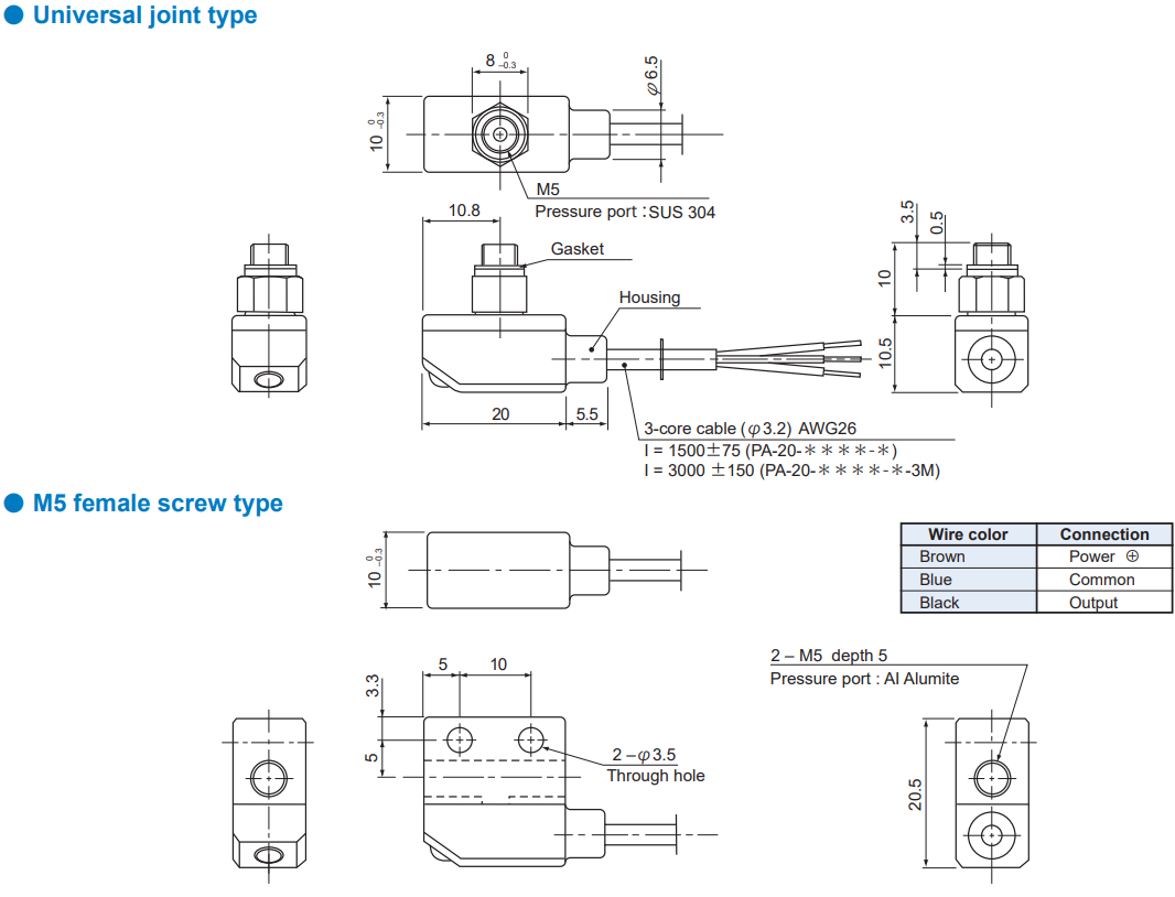 | PA-20-302R-M-3M | - 100 ~ 300 kPa | 600 kPa | 2-M5 female screw | 3 m |