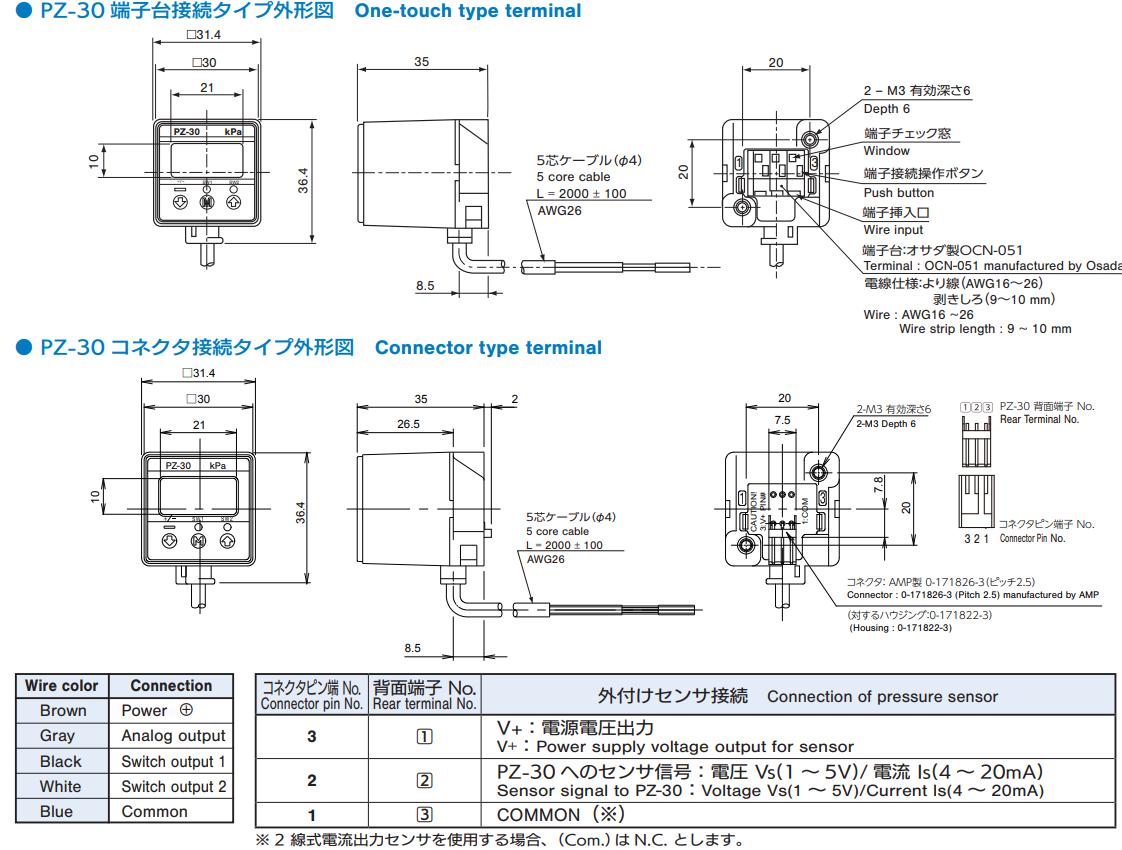 ※アナログ電流出力タイプのPZ-30を選ばれた場合、または電流出力のセンサを接続して使用する場合の駆動電圧は24VDC±10%となります。