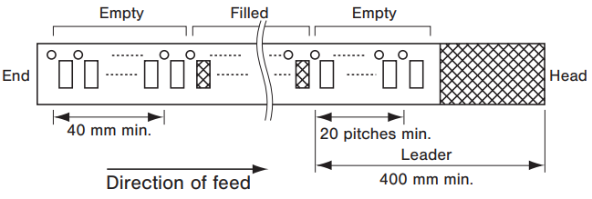 製品の脱落は、連続2個以内と致します。テープのリーダ部、空部およびリール寸法は図に示します。