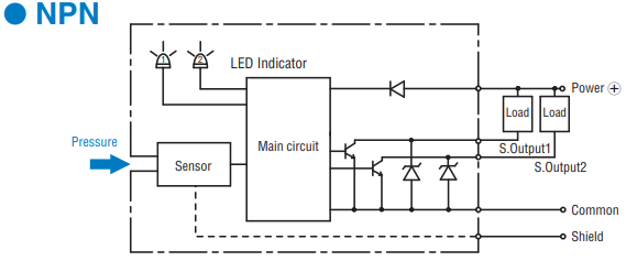 | PS91-102V-N2K2 | Gasket joint (9/16-18UNF) | NPN (Upper and lower limit mode) | - 100 ~ 10 kPa | |