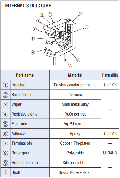 | 標稱電阻 | ➡10Ω, ➡20Ω,50Ω, 100Ω, 200Ω, 500Ω, 1kΩ, 2kΩ, 5kΩ, 10kΩ, 20kΩ,➡25kΩ, 50kΩ, 100kΩ, 200kΩ, ➡250kΩ, 500kΩ, 1MΩ, 2MΩ |