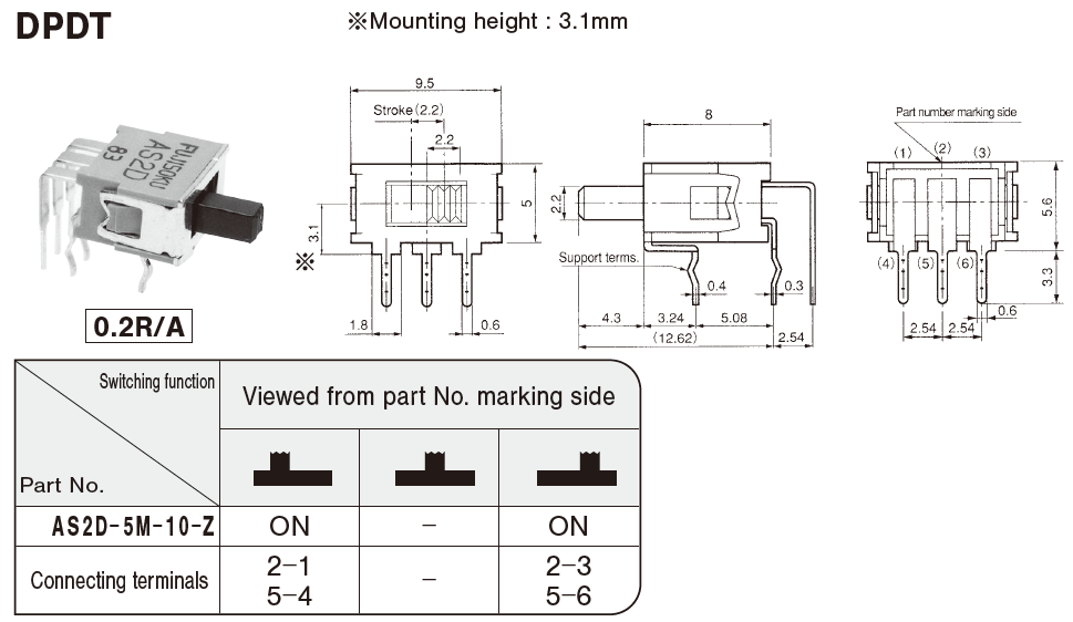AS2D-5M-10-Z | DPDT | Right angle(0.2inch pitch) | ON-ON | 從安裝面高度: 3.1 mm | |
