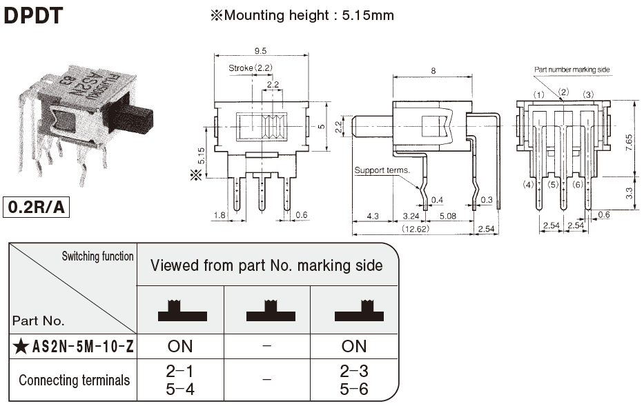 ★AS2N-5M-10-Z | DPDT | Right angle(0.2inch pitch) | ON-ON | 從安裝面高度: 5.15 mm | |