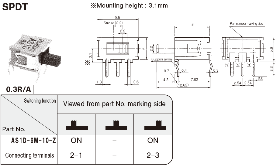 AS1D-6M-10-Z | SPDT | Right angle(0.3inch pitch) | ON-ON | 從安裝面高度: 3.1 mm | |