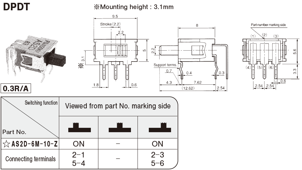 ☆AS2D-6M-10-Z | DPDT | Right angle(0.3inch pitch) | ON-ON | 從安裝面高度: 3.1 mm | |