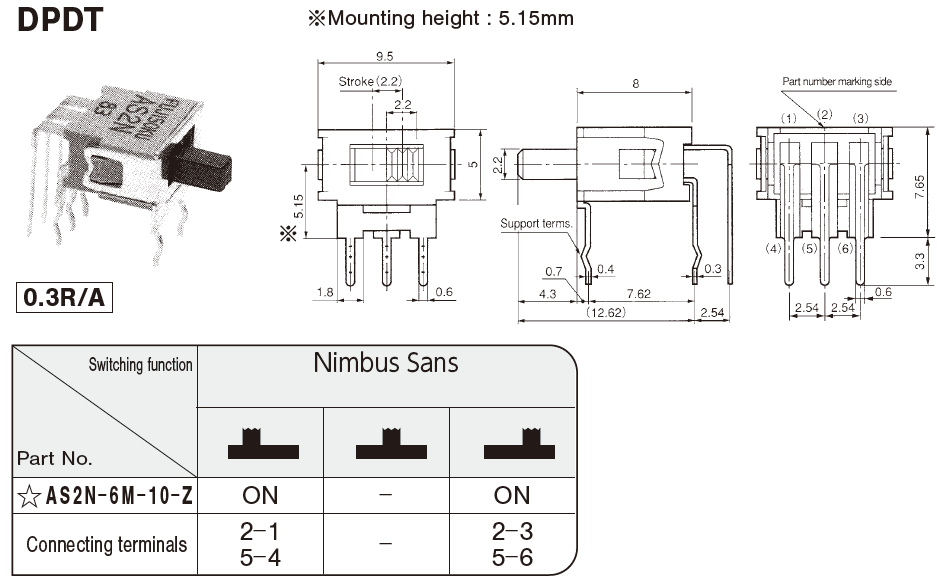 ☆AS2N-6M-10-Z | DPDT | Right angle(0.3inch pitch) | ON-ON | 從安裝面高度: 5.15 mm |